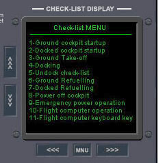 Before you go flying for the first time in the DeltaGlider II, READ THE CHECK-LISTS! They are CRUCIAL to successfully operating your craft. The check-lists are displayed in the CHECK-LIST MFD. You can view this MFD on the lower panel (press CTRL + DOWN ARROW to access it). The left ("<<<") and right (">>>") buttons on the MFD cycle through each check-list sequentially. You can scroll the currently displayed check-list by using the up or down buttons on the left side of the MFD. To see a list of all available check-lists, press the "MNU" button. These check-lists are taken from the check_list.txt