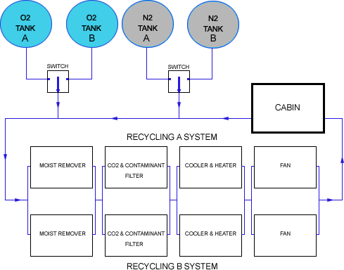 ![]() Life support system Introduction In the DeltaGliderIII, men breathe O2 and exhale CO2 back into the cabin. The missing O2 is replaced from the O2 tanks and the CO2 is eliminated by the CO2 remover. Total consumption of O2 and the amount of CO2 expelled is based on number of men aboard and their heart rates. The N2 tanks replace air lost when you operate the airlock and repressurize the cabin when you set a higher pressure. They are much smaller than the O2 tanks. You must manage all these systems to keep your crew healthy. The best way to do so is to follow the check-lists carefully. You're not obligated to make all the pressure and O2 level changes required in each check-list, but they may add to the realism. Two systems for safety! You have two O2 tanks and two N2 tanks (A and B), as well as two recycling system (A and B). However, note that the A and B switches are unrelated; in other words, the recycle button A doesn't command tank A. They are separate systems. Usually both recycling AB and tank AB should all be ON when you're in a critical flight phase like landing or take off for safety reasons. When both A and B tanks are ON, the O2 or N2 needed is taken from the A tank until it is empty, at which point it will switch to B. You can also mix the A and B recycling circuits. For example, setting MOIST to "A", CO2 to "B", COOLER to "A", and FAN to "B" will work. ![]() One MFD to see everything you need On the lower part the MFD are buttons that help you monitor and control crew health, O2 consumption, automatic system settings, and more. Click each button to see what information is displayed. You can set the cabin temperature, pressure, and other parameters by clicking the "SET" button. O2 During critical phases of flight (landing, de-orbiting, take-off) stress on the crew can be high. The chart below gives some idea of the percentage of O2 needed to maintain the health of the crew for given pressures (although bear in mind that the life support computations in the DG2 don't follow this chart exactly). ![]() CO2 Usually, in a home, the CO2 levels can vary as much as 300 - 2000 ppm. Several studies have shown that CO2 does not seriously impact human health until levels reach approximately 15,000 ppm. This level is more than 40 times greater than the normal concentration of atmospheric CO2. At extremely high levels, i.e., 30,000 ppm (these concentrations are usually never be reached in a standard home), the symptoms can include nausea, dizziness, depression, convulsions, and vomiting. At extremely high levels, loss of consciousness may occur. The seriousness of the symptoms is dependent on the concentration of carbon dioxide and the length of time the individual is exposed. At CO2 concentrations of 100,000 ppm or more, death is almost certain. The moral of this story--make sure the CO2 levels in your DG2's cabin are safe!!!